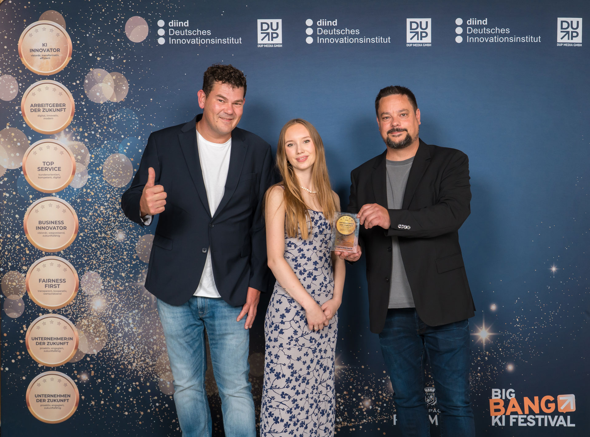 Am 10 September 2025 durften wir im Rahmen des Big Bang KI Festivals in Berlin die Auszeichnung „Unternehmer der Zukunft“ entgegennehmen – überreicht von Ines Woermann, Geschäftsführerin des diind – Deutsches Innovationsinstitut.